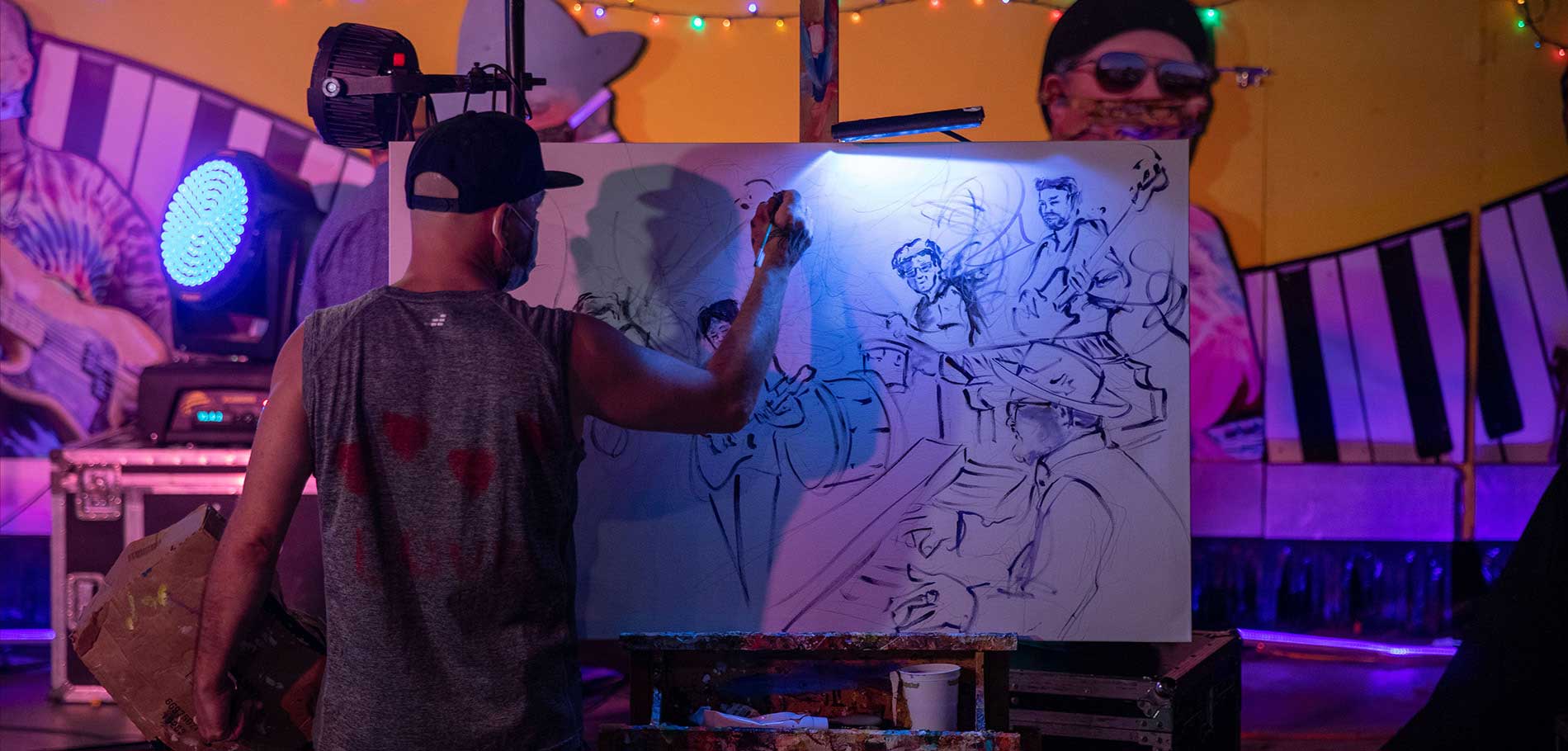 Frenchy’s energetic and spirited pieces are painted live, meaning each piece captures the specific energy of the event unfolding in front of him. Working with acrylic, oil, and watercolor, each stroke is inspired by rhythm and melodies, coming together to create entirely unique pieces of art. His work with the Funky Uncle gives music and emotion shape and color as his pieces imitate the music around him.